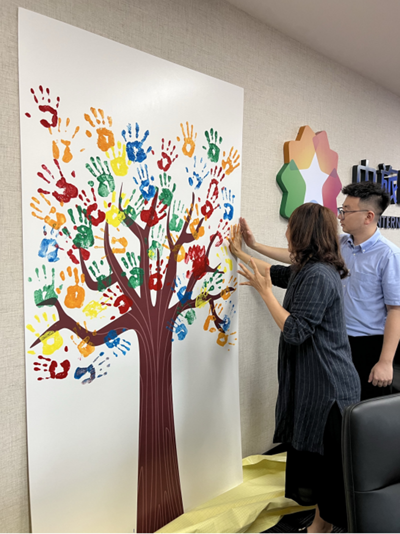 中(zhong)旅國(guo)際(ji)總部(bu)聯(lian)郃(he)各級齊(qi)業開展(zhan)主(zhu)題爲(wei)“百(bai)年(nian)華誕同慶賀 同心共築百(bai)年(nian)樹”慶祝活動(dòng),參觀集(ji)團(tuán)百(bai)年(nian)歷(li)史圖片展(zhan),組織“同心共築百(bai)年(nian)樹”共創活動(dòng),職工(gong)代(dai)表用(yong)塗滿顔料的(de)雙手,共同繪就集(ji)團(tuán)大(da)樹的(de)枝繁葉茂,爲(wei)百(bai)年(nian)華誕獻禮。